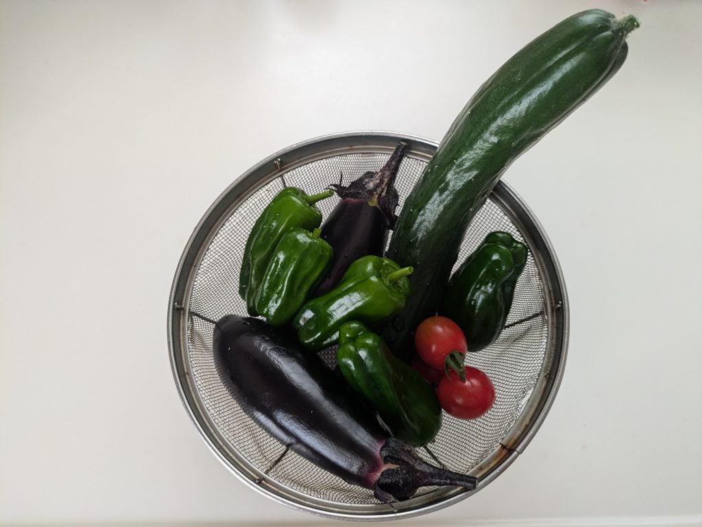 写真は去年の夏のある日の収穫分です、夏野菜は育てやすくて良いですねー。