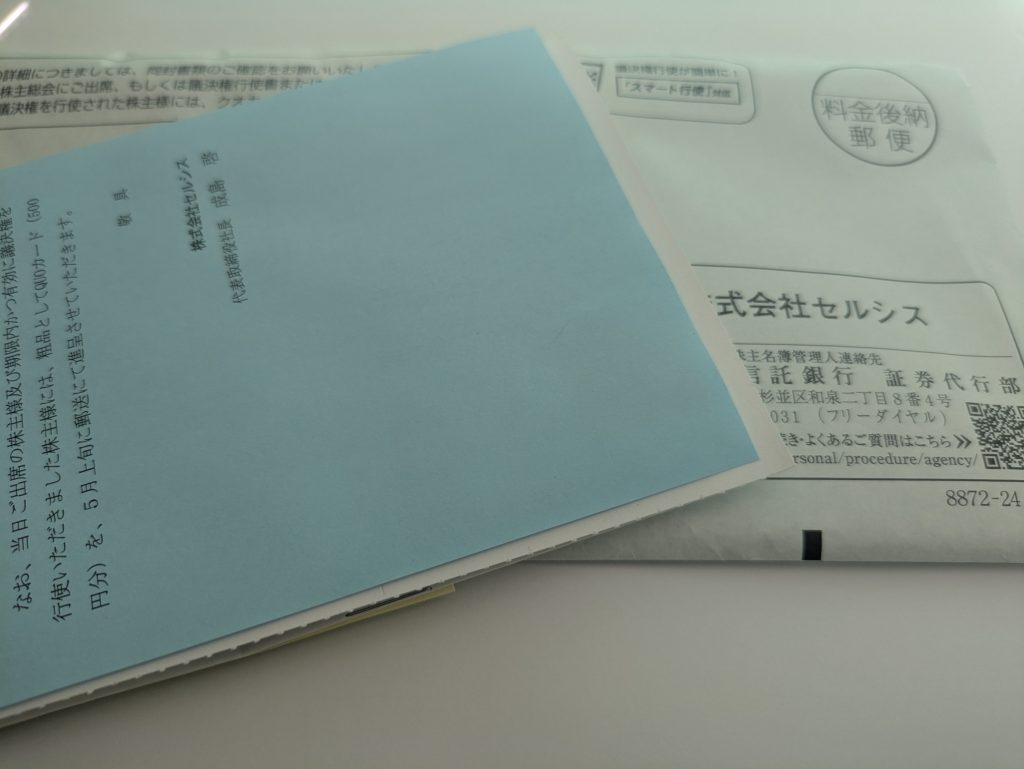 株主優待かなと期待して開けたところ、ただの議決権行使書のお手紙でした。(それも大事ですが)