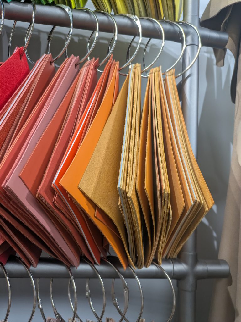 同じ部屋には実際のバッグとそれに使われた革のパーツが並べて展示されています。