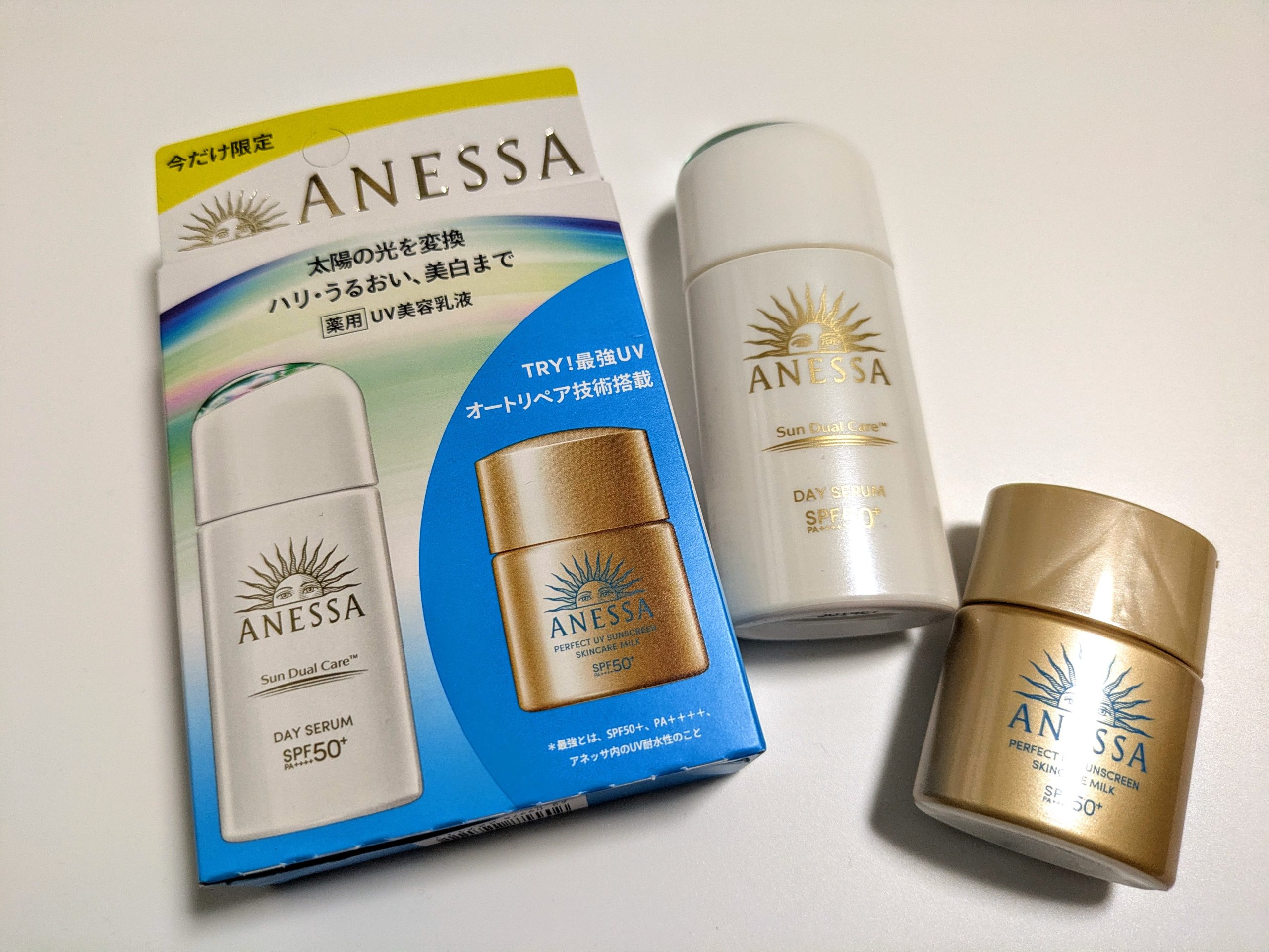 というわけで、アネッサのデイセラム(顔用)にスキンケアミルク(顔・体用)のミニサイズが付いたものを買いました。