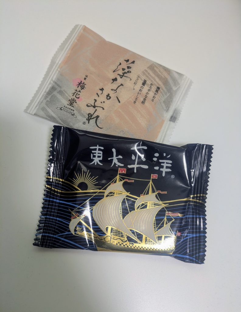 東太平洋はラム酒のたっぷりしみ込んだバタークッキー、藻なかさぶれは藻の入った生地と最中をあわせた軽い食感のお菓子です。