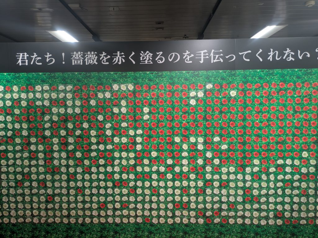 ハーツラビュル寮の5人+アニメ版の主人公雄剣くんの等身大アクリルパネルの展示と、白いバラのシールをはがすと赤いバラが現れる『バラを赤く塗ろう』キャンペーン。