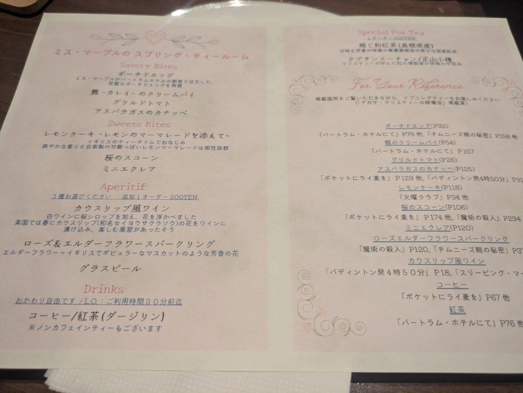 メニューの裏面にはクリスティやミス・マープルにまつわるクイズになっていて、全問正解すると紅茶が頂けます。